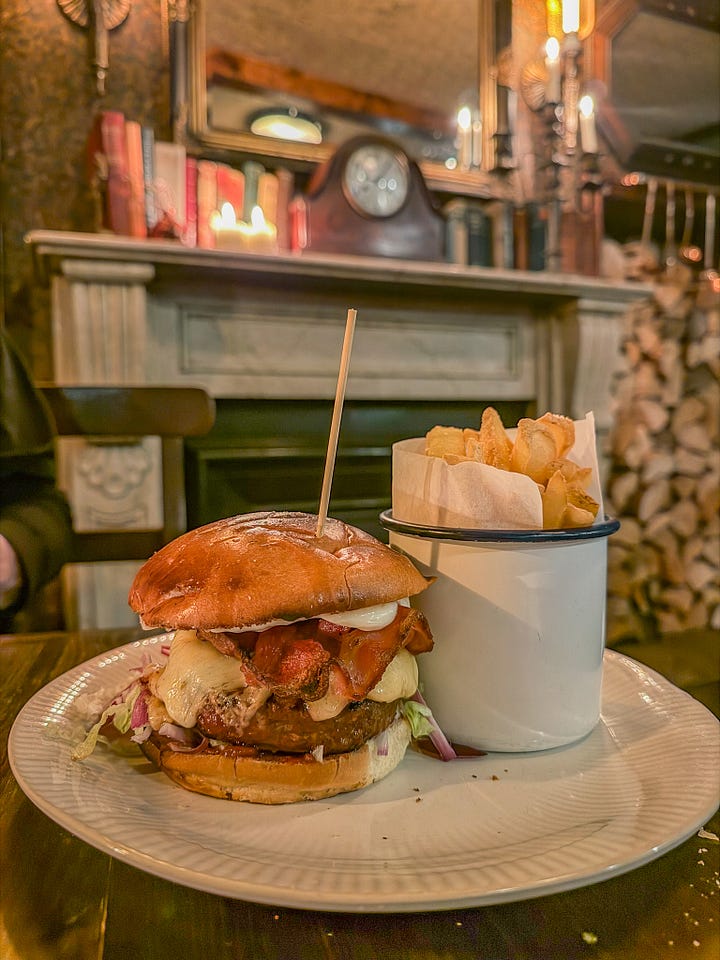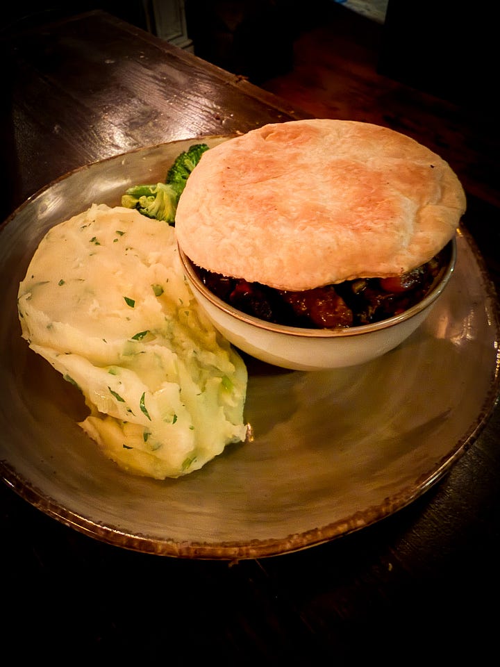 The pub is Merry’s, of course, and there are a pair of tables proximate to the fireplace, and of course they are the tables we are drawn to, like moths to the flame.