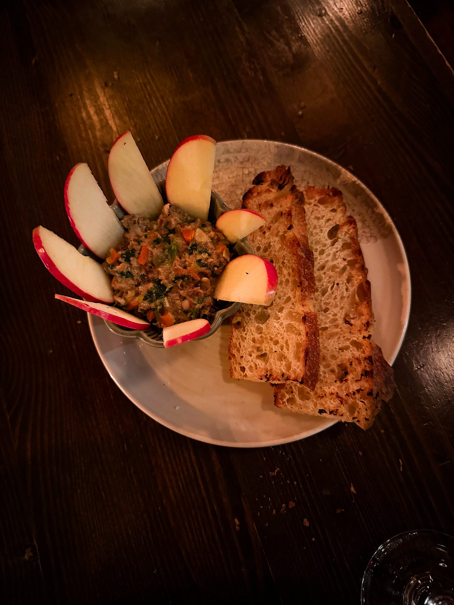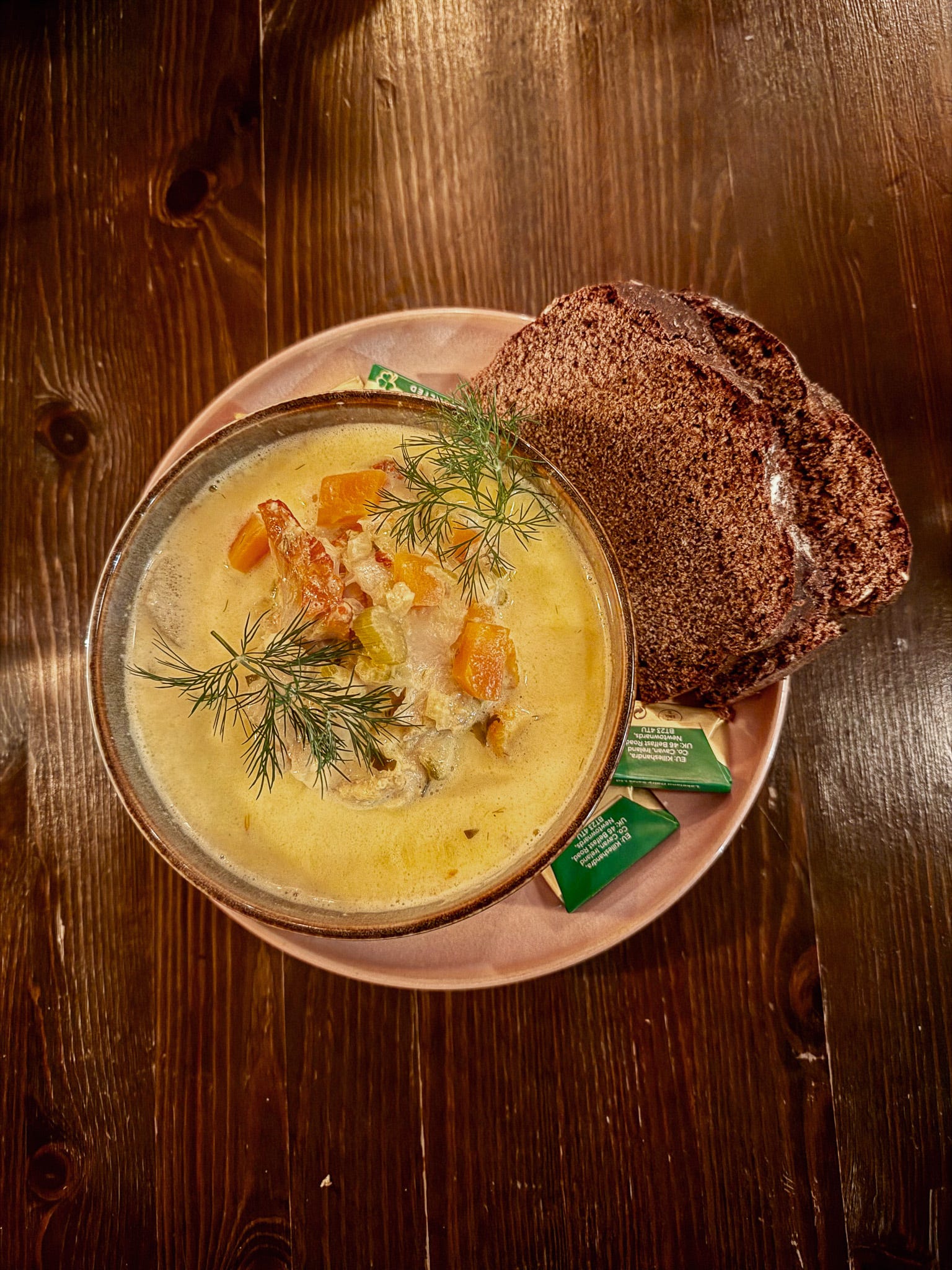 Even on a relatively quiet weekday evening, there is a buzz about the place as people settle into the snugs and the bar and the restaurant tables fill up. We started with that fine pig’s head terrine, ringed by apple slices and some top-notch focaccia from Dun Bakery, and with the pub’s seafood soup, an atypical riff on an Irish chowder, but with a welter of fresh fish, garnished with sprigs of dill and with brown bread and butter on the side.