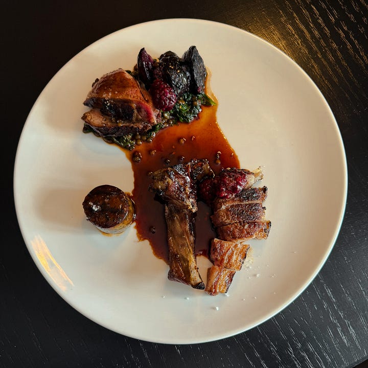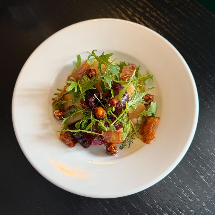 The small plates showed again how well this pair learn from their mentors, because the local crab was served on Beamish bread, which Rob learnt from Bruce Mulcahy. It was demon, just right for the crab which uses some of the crab roe to deep end the flavour. It was Joe’s turn next to show how he has mastered live fire whilst working at Allta: grilled chicken thigh comes on a homemade yogurt flatbread, with tzatziki, a miso emulsion and pickled red onion. Even the modest-sounding celeriac and beetroot salad comes with smart tricks like whipped tofu and candied hazelnuts, with shards of crisp pancetta.