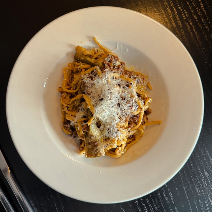 The restaurant is adjacent to the bar – which has the narrowest entrance door in West Cork – and is a long, cosy space, with deep green wainscoting and a low-ceiling. The menu offers four snacks, three small plates, a pair of fresh pasta dishes, and four mains of meat and fish, with a couple of sides.