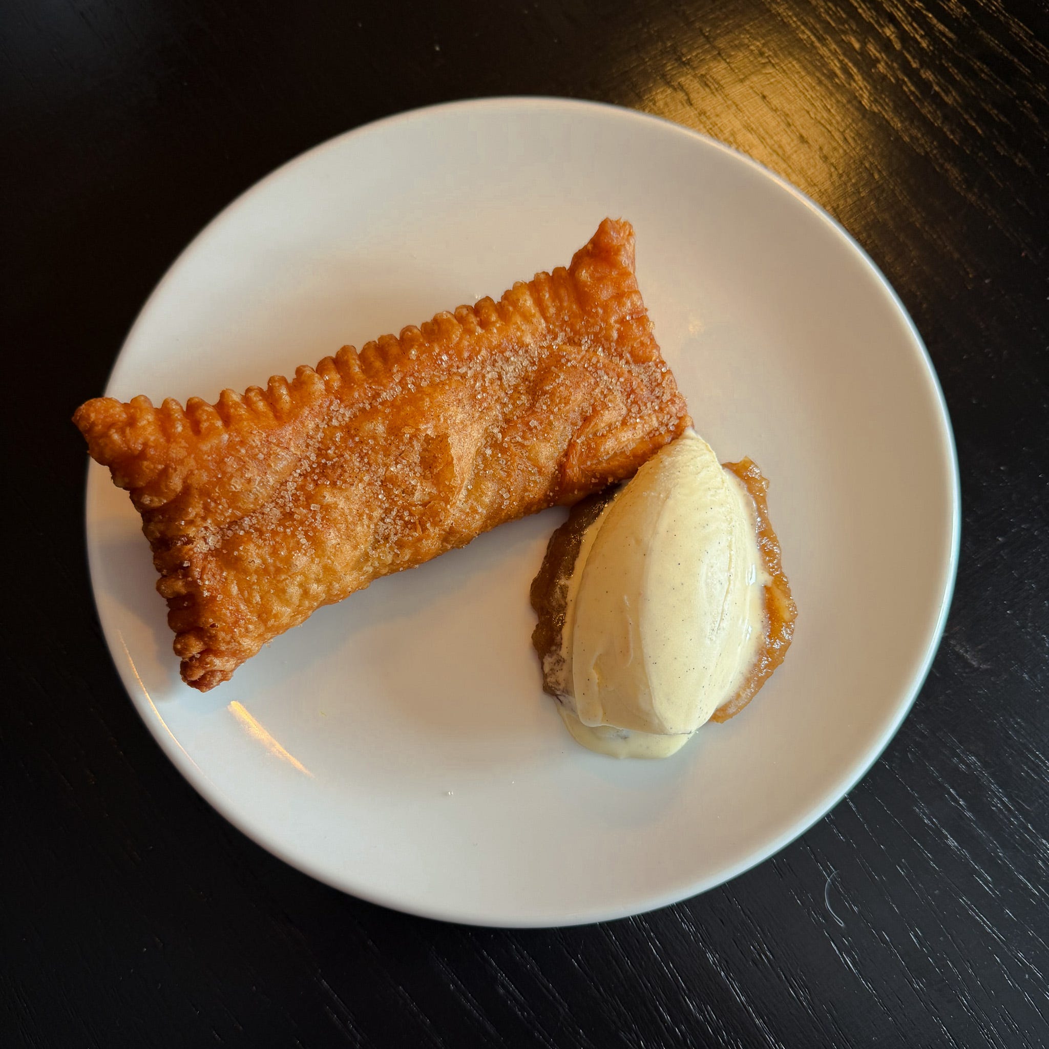 The team bring a lovely element of playing around with ideas with their dessert of crispy apple pie, with house vanilla ice cream. This a jokey tribute to the McDonald’s pie which has burnt the mouths of millions over many years. The MH version is ace: super pastry dusted with cinnamon sugar, and a tactile, lactic ice. The same ice cream comes with a good espresso as an affogato, and the team have wisely chosen to use the splendid local Stone Valley Roasters beans, which makes for great drinking, and eating. We also managed to taste a new pudding of pannacotta with torched rhubarb and mint, but it will be the apple pie that will dominate your insta streams over the coming months.