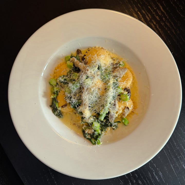 Niall Davidson in Allta will also teach you that cooking meat involves dealing with an entire animal carcass, whilst Ross Lewis will show you what al dente actually means when it comes to pasta. The result is a lamb ragu tagliolini, made with the hogget shoulder, and paired with violet artichokes, a scatter of mint, a cloud of Cais na Tir cheese, and the intriguing element of juniper. Fresh ravioli, shaped like sun emoji, also sport those fine blue oyster mushrooms along with kale and asparagus.
