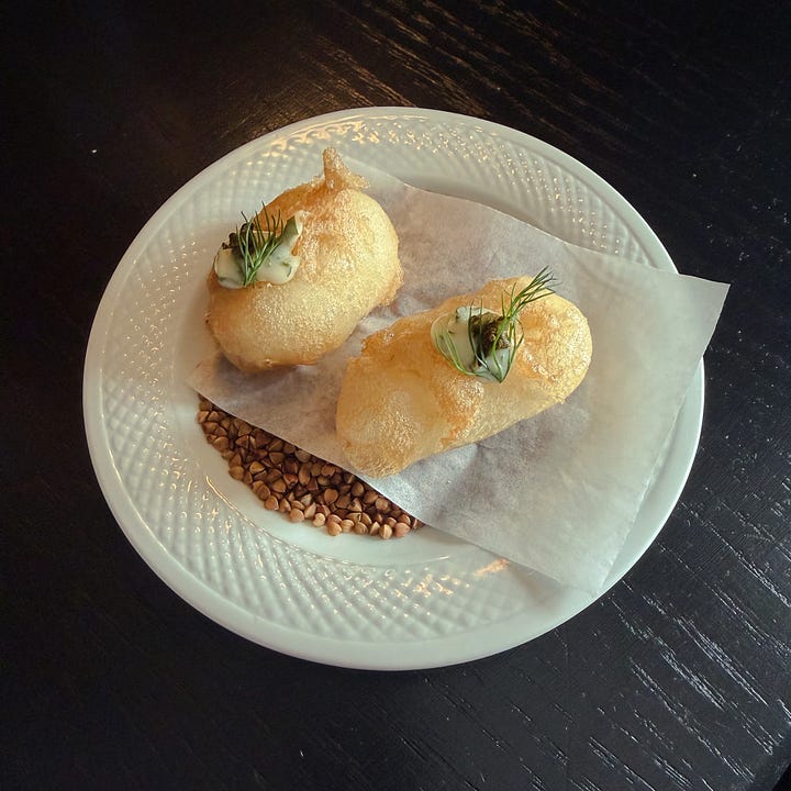 Right from the kick off, the kitchen was crushing this menu. A tempura of blue oyster mushrooms had a batter light as a spider’s web, enclosing locally-grown mushrooms that defined umami. The oomph! of flavour was explained by the fact that the kitchen use the mycelium at the base of the mushroom and process it with kombu – hunter-gatherer how are ye! Tempura of hake was a neat, amusing tribute to fish’n’ chips, whilst the house focaccia is a bread Joe learnt from Ross Lewis at Osteria Lucio, and is the most lush companion for aubergine dip, cultured butter, and a superb olive tapenade.
