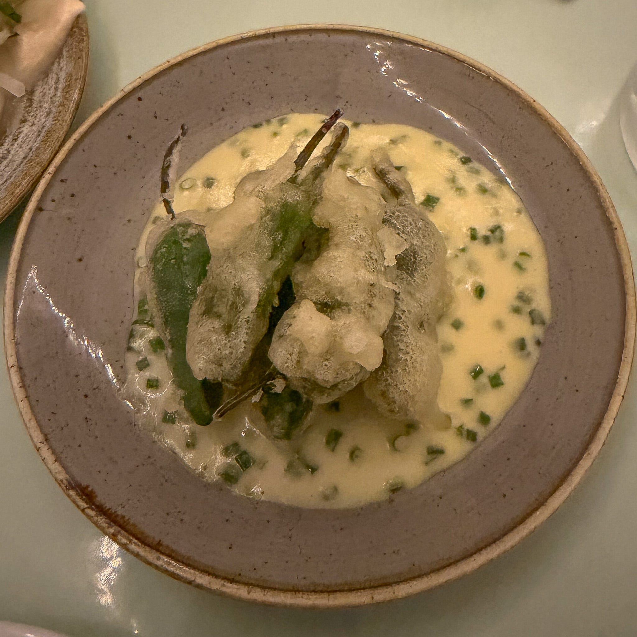 The tempura batter coating the padron peppers was almost shell-like, crunching like a prehistoric poppadom, before giving way to the grassy bitterness of the padron. Underneath, a Parmesan sauce provides a rich bass note to the ethereal batter. Killer dish.