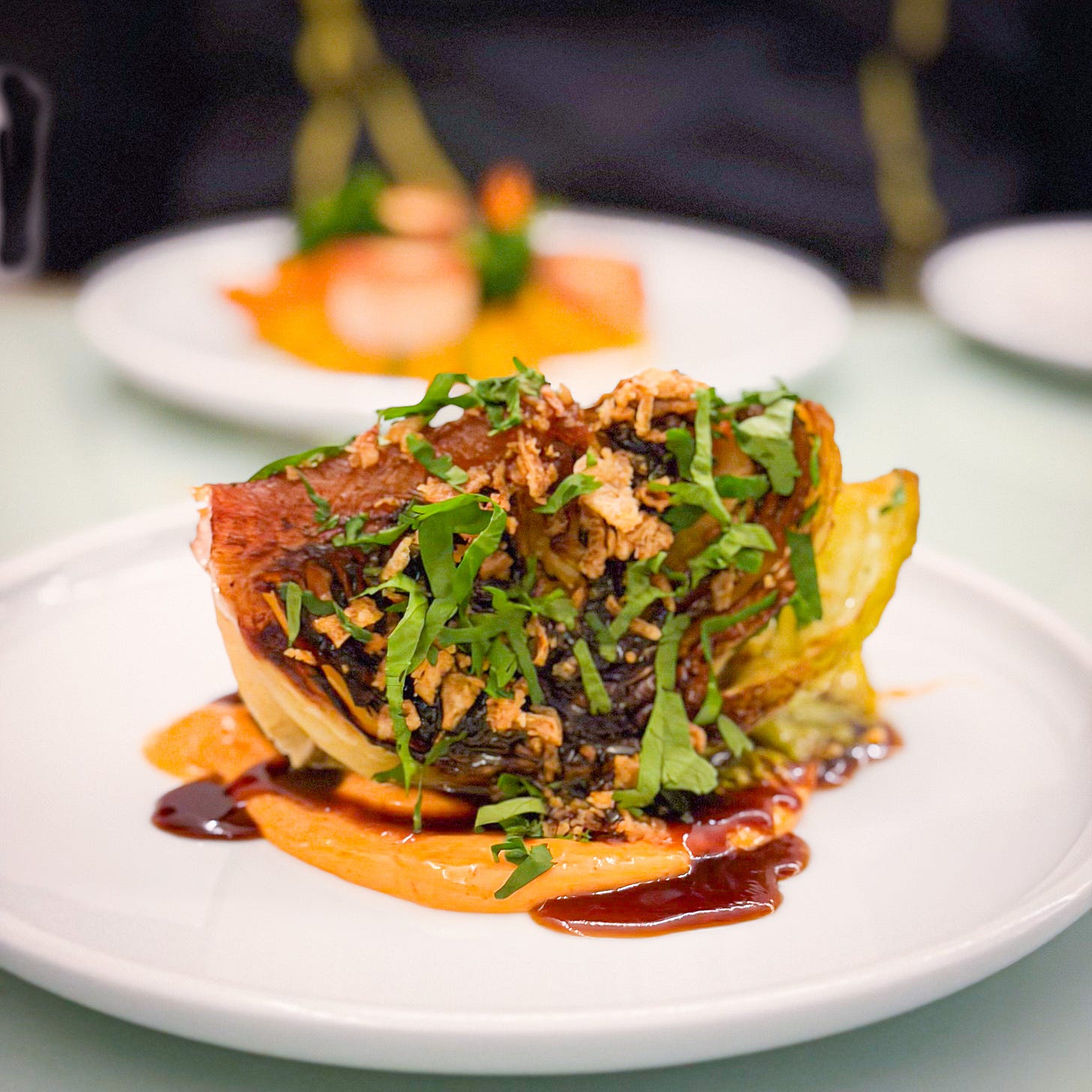 Andrew Kelly’s food pays proper homage to the sparkling plant foods he sources from Abercorn Farm in Wicklow and from the McNally Family Farm in North Dublin. His ability to double his ingredients, to offer a duet of textures and tastes, means the vegetables shine time after time, the plates offering odes to cabbage and pumpkin, sweetcorn and carrot, cabbage and peppers. This is plant-based eating for the Gods, conjuring inventive, exciting and original dishes, and when he does opt to put meat or seafood protein on the plate, the vegetable cooking is the support act that steals the show.