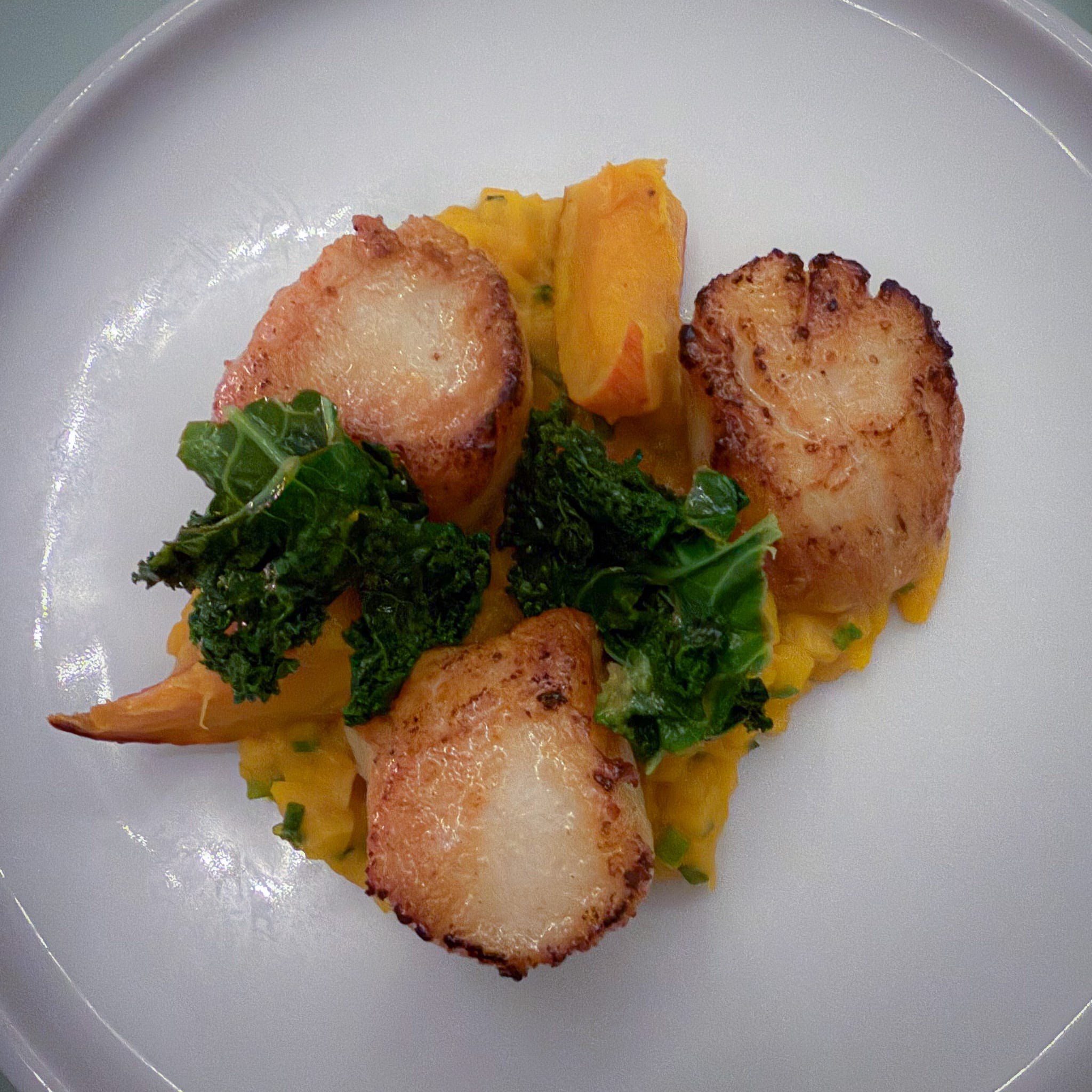 Scallops with Hokkaido pumpkin and kale takes a trio of plump shellfish and sets them alongside tiny pumpkin dice and larger pumpkin slice, with crunchy kale to offset the sweetness. What appears as simplicity on the plate is, again, complex and involving, the textures switching and changing from bite to bite.