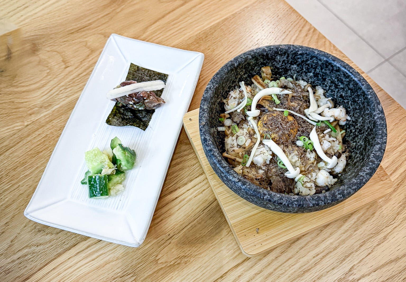 At weekends there are special dishes and you can BYOB, so we returned on a Sunday evening with a nice bottle, keen to see how Jae and Michael push the menu beyond its daily parameters. The special was wild mushroom and prawn pot rice with French black truffle, served with side dishes of beef tartare and smashed cucumber salad.