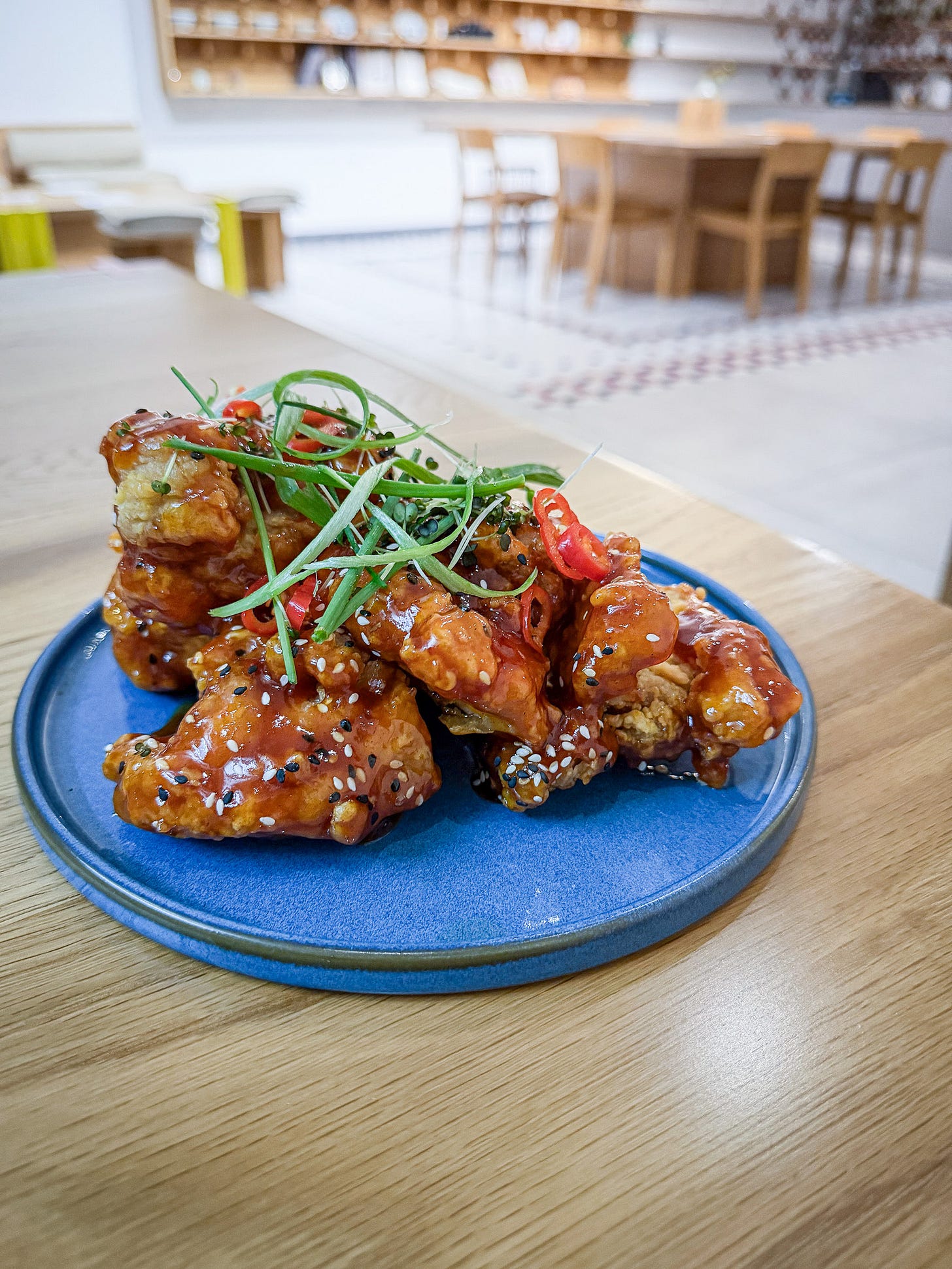 The gochujang sauce with the tteokbboki was indeed hot, coating the cylindrical tubes of rice cake, and topped out with pieces of fried chicken with the crunchiest batter. Shards of scallion, half a cooked egg and a scattering of white and black sesame seeds finished a dish of great beauty and whizz-bang flavours.