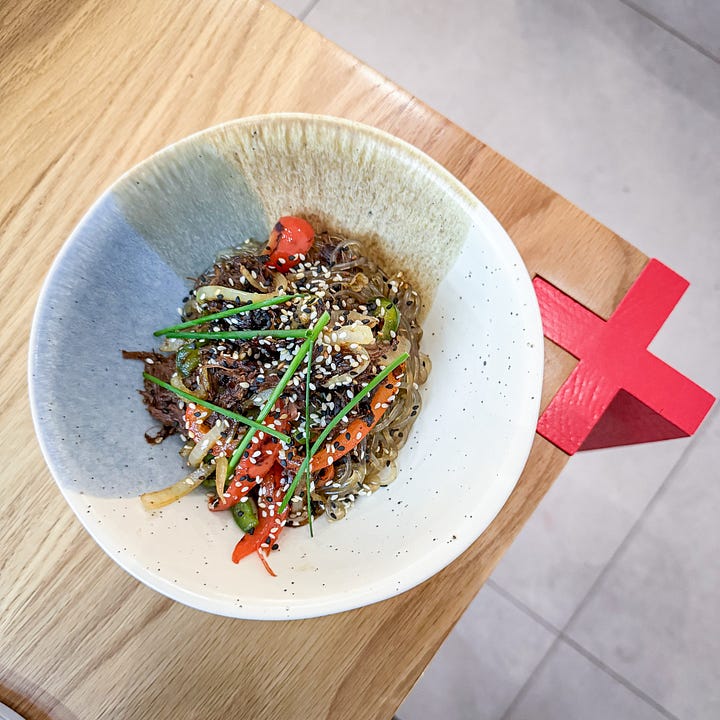 We also ordered the japchae – glass noodles with beef and vegetables – a side of kimchi, some miso aubergine, and a few pieces of Seoul fried chicken in Yang Nyom sauce because, you know, fried chicken.