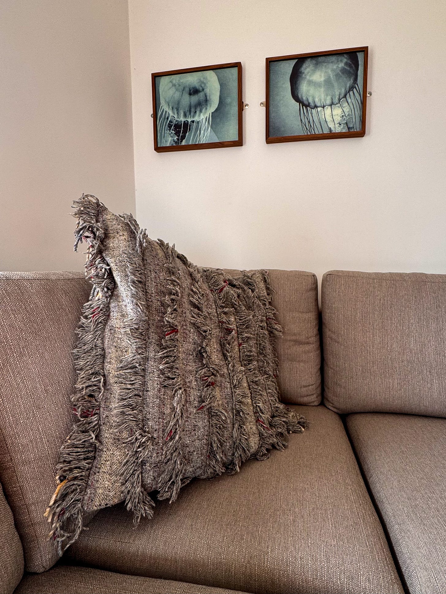 The luxurious tactility is amplified by the work of local craftspeople and artists, whose creations enable the function and define the form of the houses. You drink locally roasted Calendar coffee from a Roundstone Ceramics mug whilst enjoying the scones, freshly baked for the house by Anne and delivered each morning. The walls and recesses are hung with works by Dorothy Cross, Roisin Coyle and Cliodhna Prendergast, with the extraordinary nest baskets of Joe Hogan. Each surface – from Joshua Gabriel’s woodwork in the kitchens to Paddy O’Malley’s intricate countertops in the bathrooms to the Tweed Project throws that lie atop the Inish Living super luxurious bio-based bed sheets – has been seized as another chance to make an aesthetic statement.
